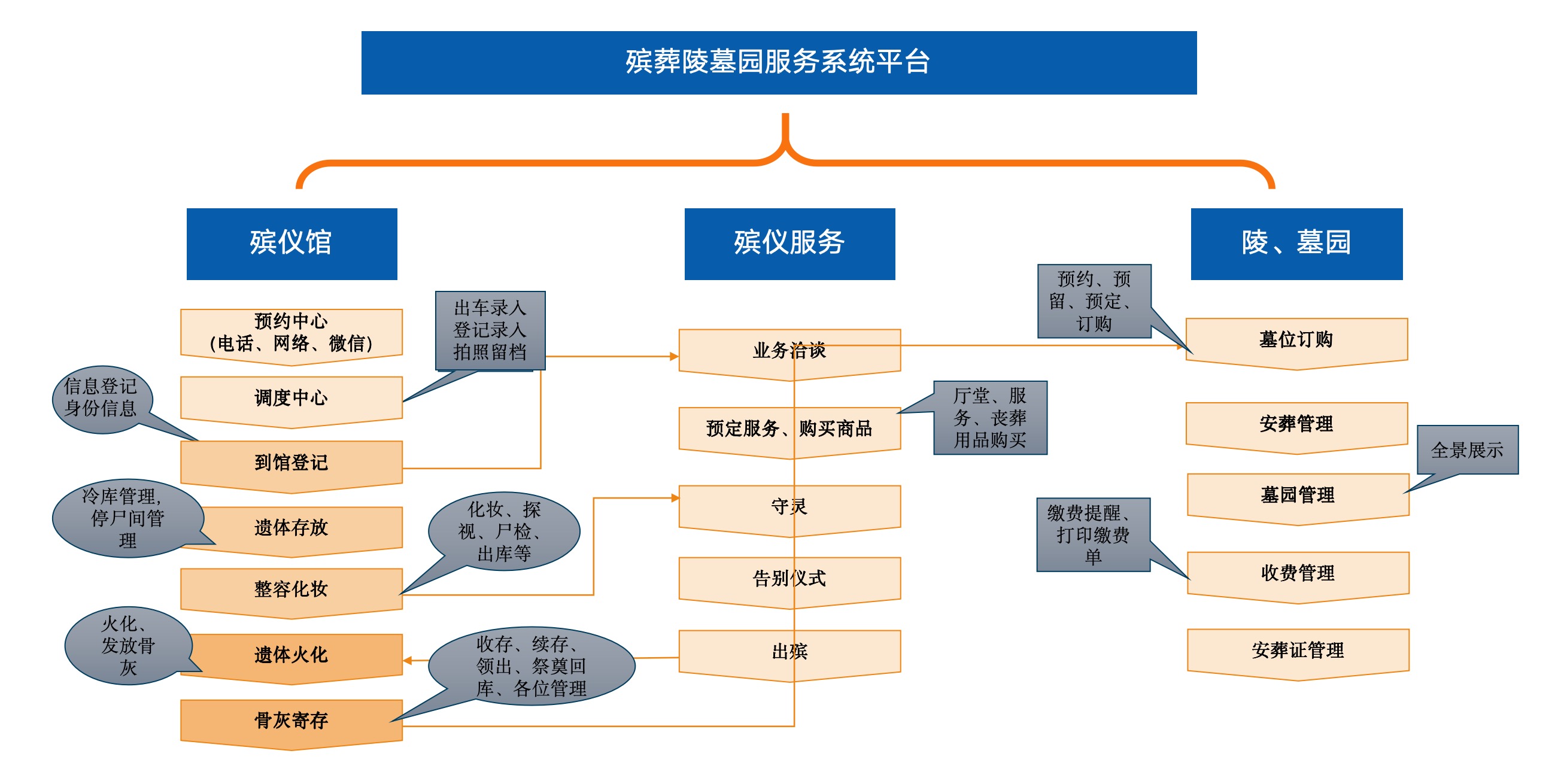 1、为更方便丧属办理业务,满足工作人员移动办理殡葬业务的要求,将殡仪馆接运、业务办理、冷藏办理、整容办理、礼厅办理、火花办理,墓园移动销售、巡检报修、云祭扫任务处理,行业监管巡查,考勤打卡,网络会议,死亡信息填报等业务纳入到移动办公领域,借助移动互联网的便利性,提升整个智慧殡葬业务办理效率。